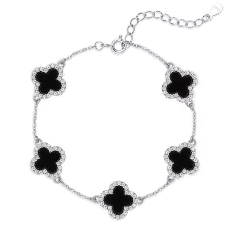 This stunning Sterling Silver Diamond Clover Bracelet with 5 motifs is perfect for adding a little sparkle to any look! Crafted with sterling silver & genuine black onyx stone. Each clover is highlighted by a halo of tiny sparkling stones, this bracelet makes an elegant, on-trend addition to your jewellery collection.