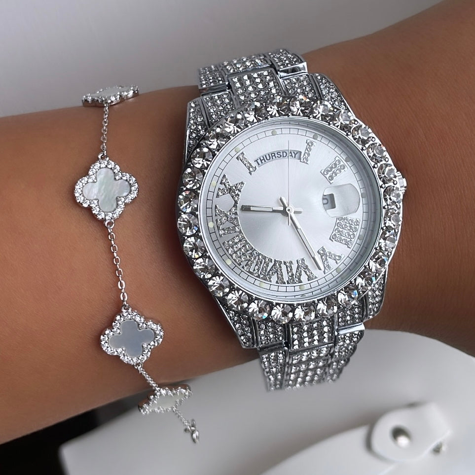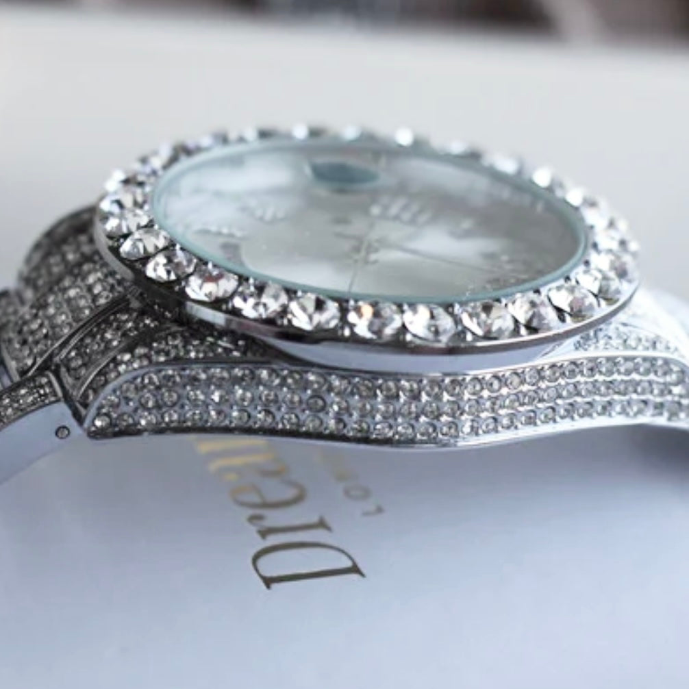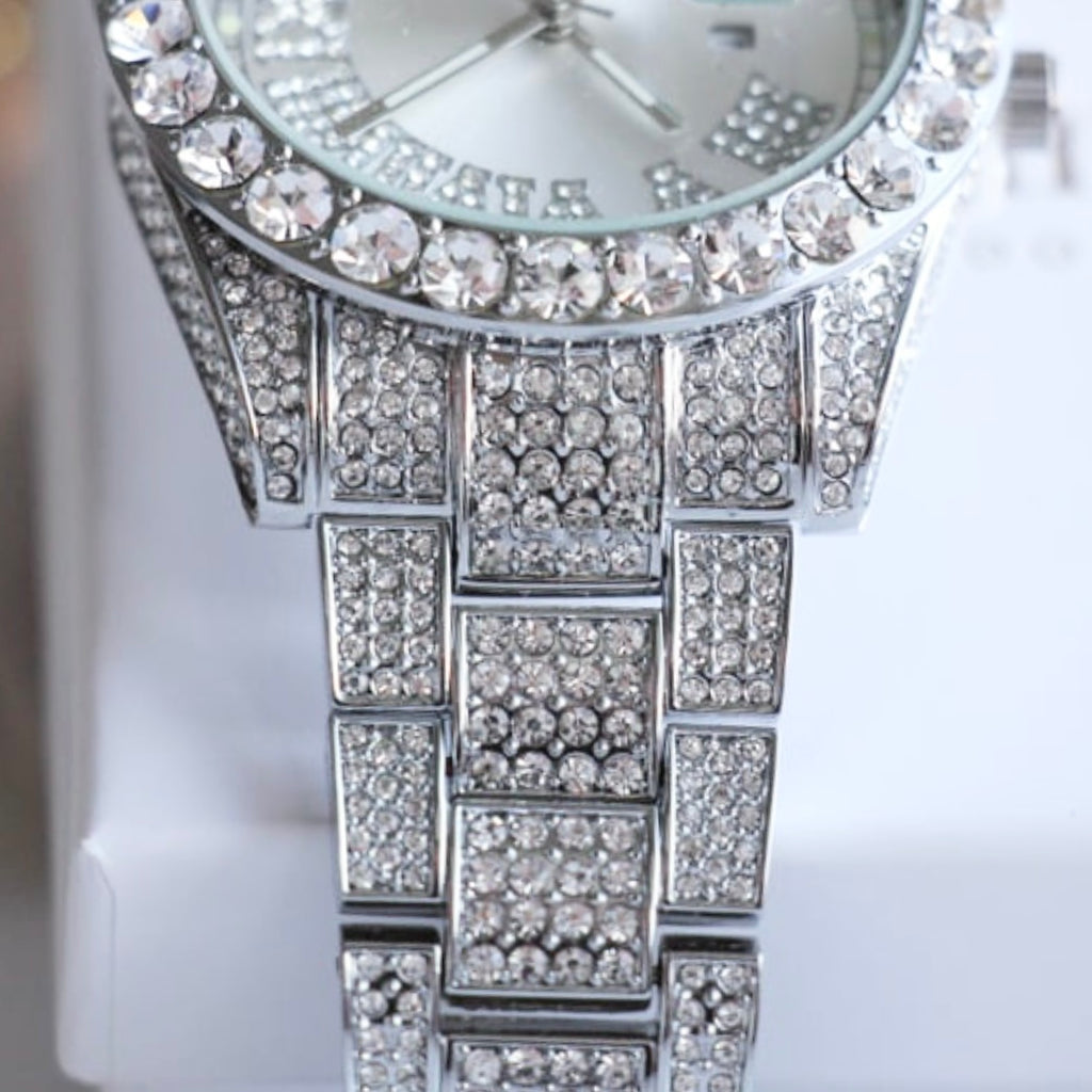 Adorned with sparkles, this watch features a beautiful silver face & iced out roman numerals. An extravagantly designed statement piece with undeniable sparkle, guaranteed to keep your wrist glistening.