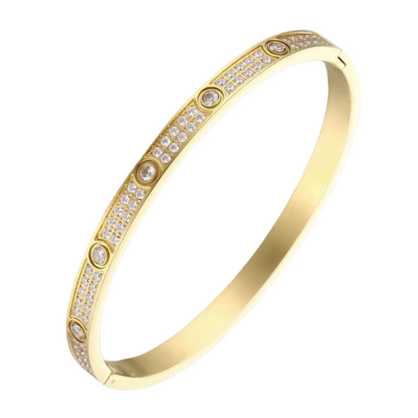 Enhance your wrist with our stunning 18k gold bangle adorned with sparkling CZ diamond simulants, hand-finished for the perfect touch of elegance.