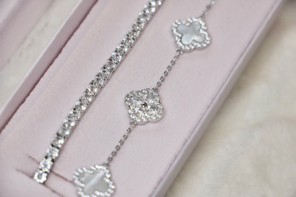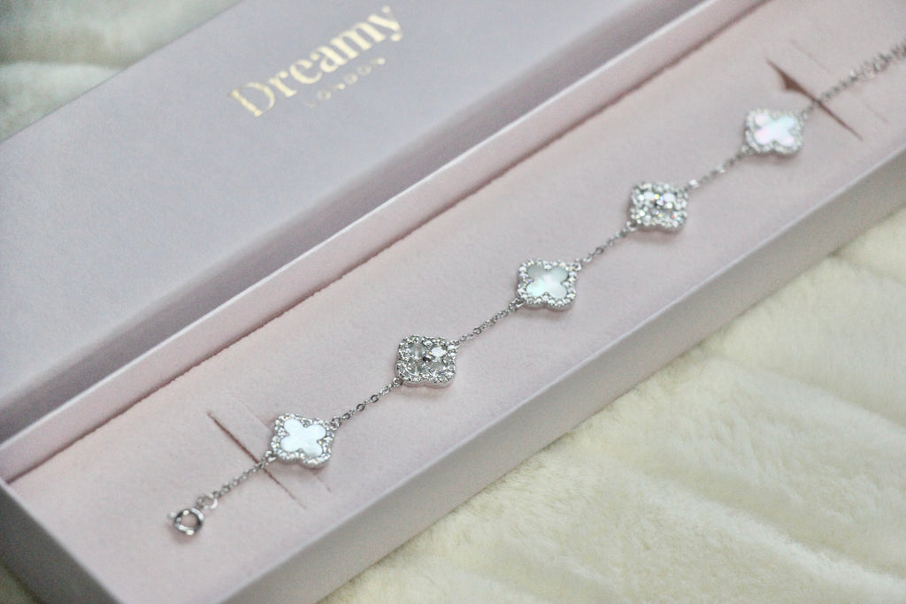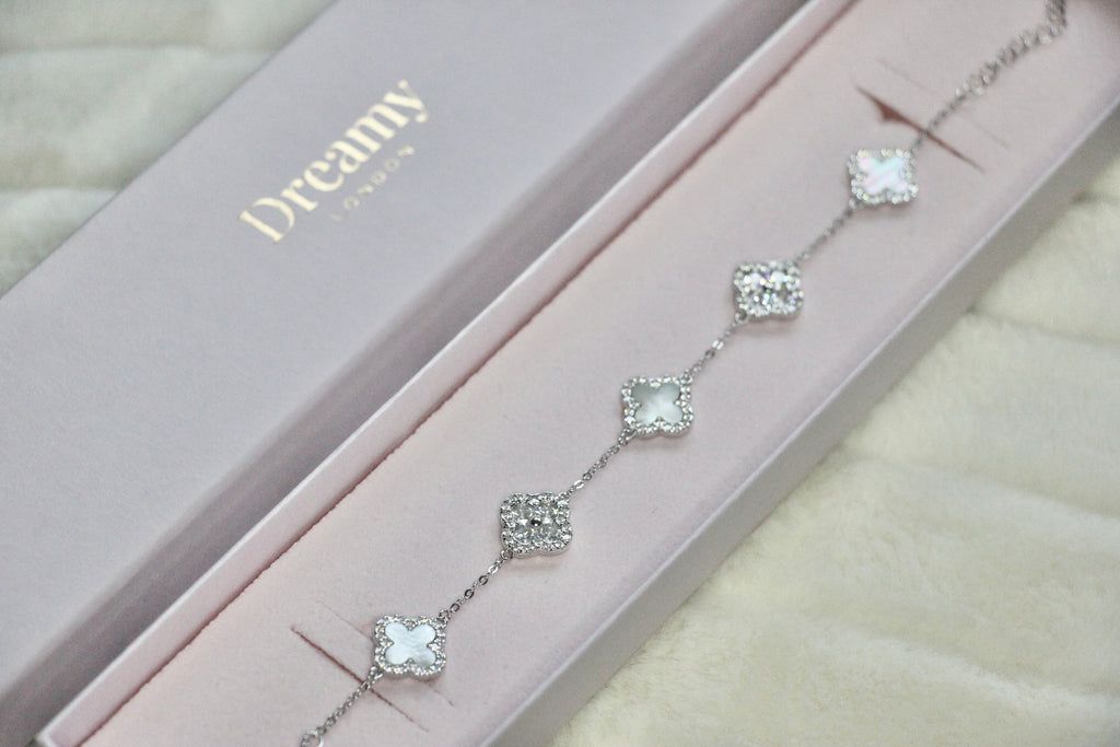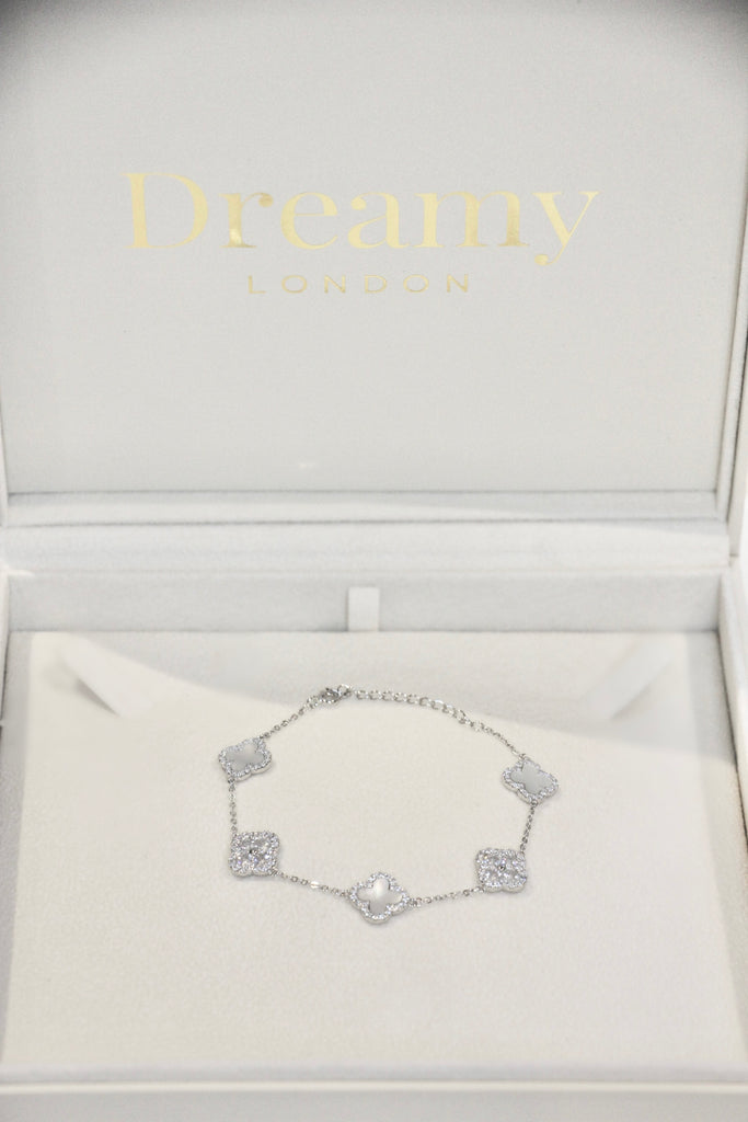 This stunning Sterling Silver Diamond Clover Bracelet with 5 motifs is perfect for adding a little sparkle to any look! Crafted with sterling silver & real mother of pearl. 3 clovers are highlighted by a halo of tiny sparkling stones, whilst 2 clovers feature an incredible sparkle that catches your eye every time you wear it.
